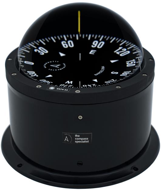 The conical card design allows a wide range of viewing angles and the inbuilt clinometer makes this compass a popular choice for sailing vessels. The compass features a fairly wide flange so it can be a good choice when replacing an existing compass – the flange sizes allows installation where a large aperture has already been cut or can be used to cover fade marks on the bulkhead. The compass is available in black with dual voltage illumination as standard.