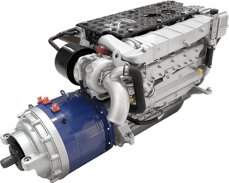 Very compact sized marine diesel hybrid powertrain (from 13kw up to 25kw in electric). Thanks to our high technology, our FNM Blue Hybrid System powertrain permits to switch from diesel-electric to electric- diesel in easy and fast way. It allows to change propulsion from electric to endotermic (Diesel) in a moment, providing maximum power in case of emergency maneuver or duringdocking maneuvers. So, we are the only ones who allow you to navigate the hybrid equal to a hybrid car this is our characteristic