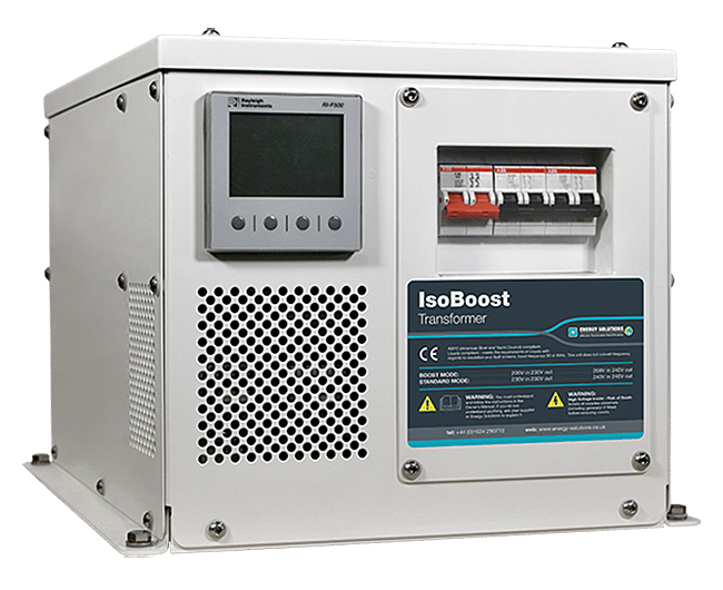 The Energy Solutions IsoBoost transformer provides a cost effective and reliable solution to isolate and manage a shore line. It provides all of the features of a normal isolation transformer, as well as providing a boost function to manage the volt drop on heavily loaded shore lines, or to cope with a 208V (phase to phase) supply.
