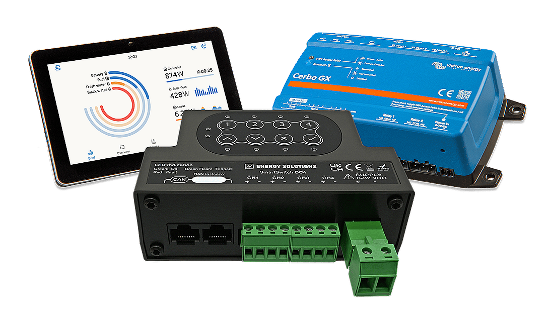 The SmartSwitch DC4 is a revolutionary product in digital switching that simplifies system wiring and control functionality onboard a vessel. With a single cable, the SmartSwitch connects to your digital control panel, enabling an additional ‘switch function’ for one-touch control of lights or DC loads. This eliminates the need for external manual switches, often located away from the main control panel. SmartSwitch is the only digital switch on the market to fully integrate with Victron Cerbo.