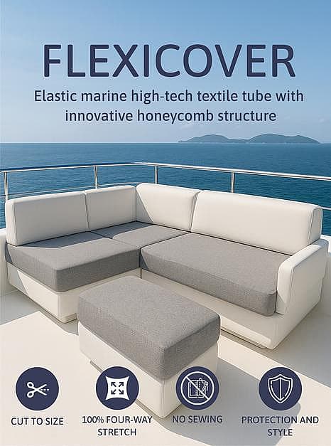 FlexiCover is the world’s first seamless elastic sleeve for yacht cushions. Made from recycled high-tech textiles, it offers an affordable, sustainable and user-friendly alternative to costly reupholstery. The sleeve adapts to any cushion shape with 100% stretch, requires no sewing, and is UV-stable, washable and durable. FlexiCover protects against sun, salt and dirt while instantly refreshing worn cushions – renew instead of replace, easy, smart and sustainable.