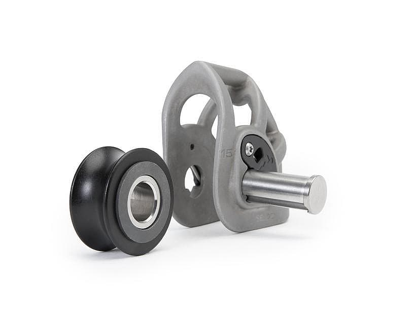 The Seldén clew block is significantly smaller than comparable products on the market. Made of stainless steel, the body of the block allows for tight attachment points between the webbing bands. Being placed close to each other, wrinkles between the webbings are prevented. Reduced size minimizes sailcloth waste. The removable sheave, or low friction insert, allow for easy installation of outhaul to the sail. Only the sheave/low friction insert is dismantled and the locking pin is captive.