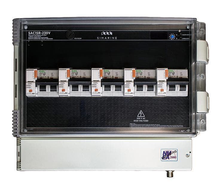 SAC15R is a 5-channel 115/230VAC distribution unit with motorized reclosers, designed for marine safety and integration. NMEA2000 compatibility enables remote switching from any control or navigation interface, with no need for direct contact with live AC parts. A manual override provides redundancy in emergencies. Units can be daisy‑chained for system scalability. Built splash‑proof to IP33, it combines affordability, technical reliability, and compact performance for sailboats and motorboats.