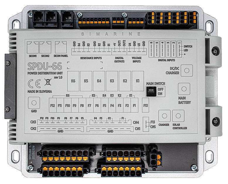 The SPDU-66 is Simarine’s high-capacity 12 V DC distribution unit. It provides 6 switchable outputs (combined limit 100 A), 4 current-measuring channels for solar, charger, main battery, and DC/DC (0–50 A), 6 digital inputs for external switches, plus voltage (U1–U4) and resistance inputs for tanks/temperatures (0–65 kΩ). Typical draw is ~15 mA at 12 V. It connects into Simarine systems and works with PICO/VIA and the SK8 keypad for expanded control. Dimensions: 200×160×42 mm.