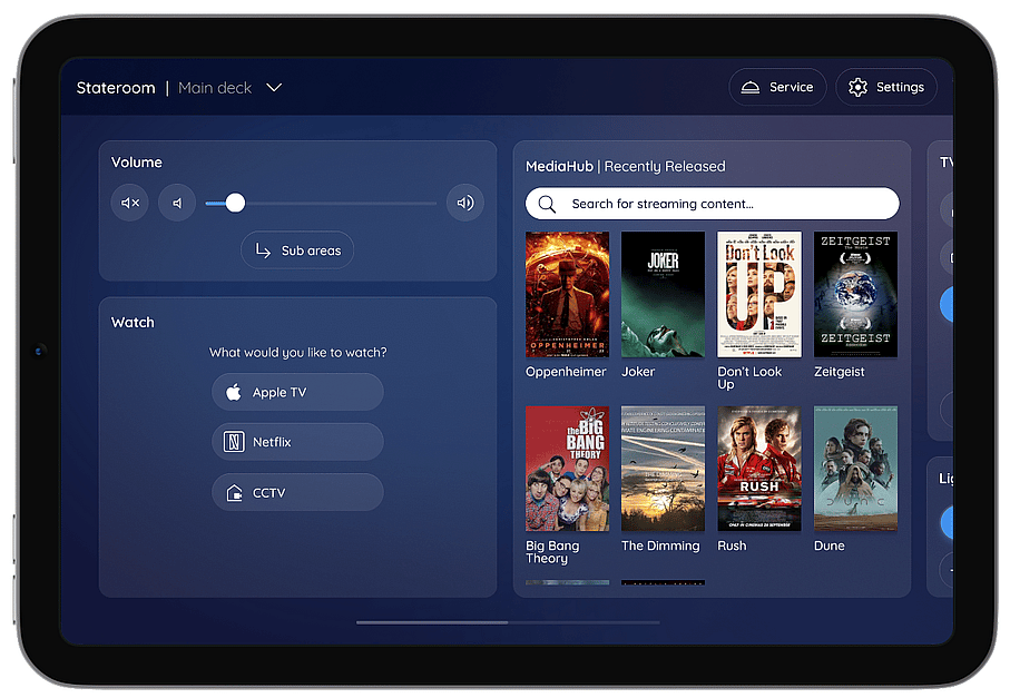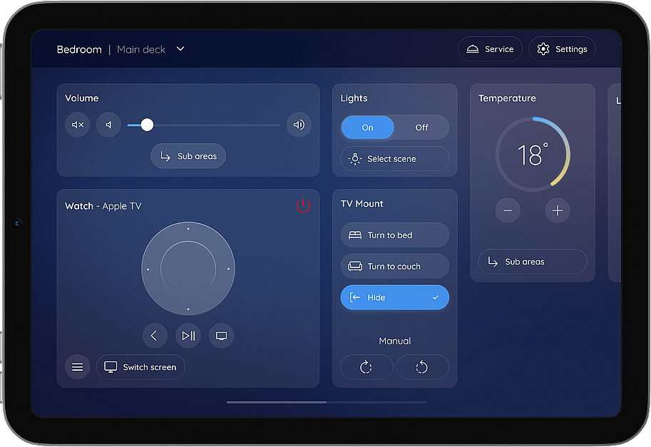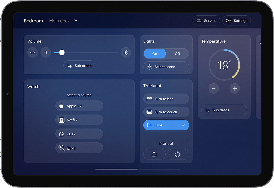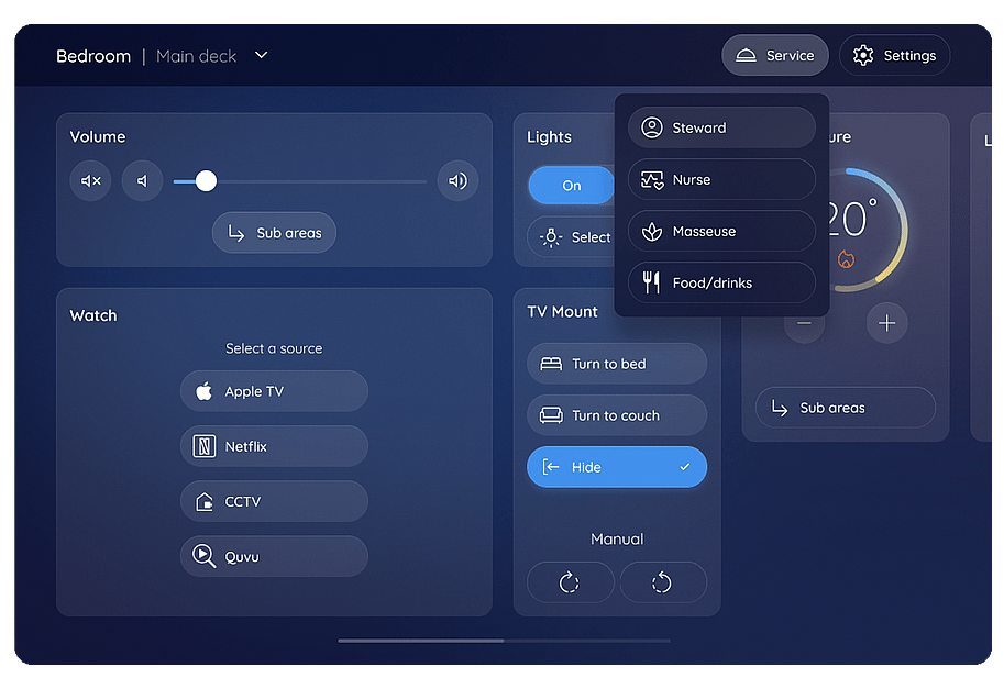 Guida is an advanced, intuitive app that that gives you complete control over your yacht’s environment with just a few taps. Owners and guests can effortlessly set the desired ambiance and entertainment, and Guida will adapt seamlessly as they move through different spaces onboard. Designed to integrate with any existing ecosystem, Guida works on any platform, offering the most flexible, sleek, and advanced control interface on the market.