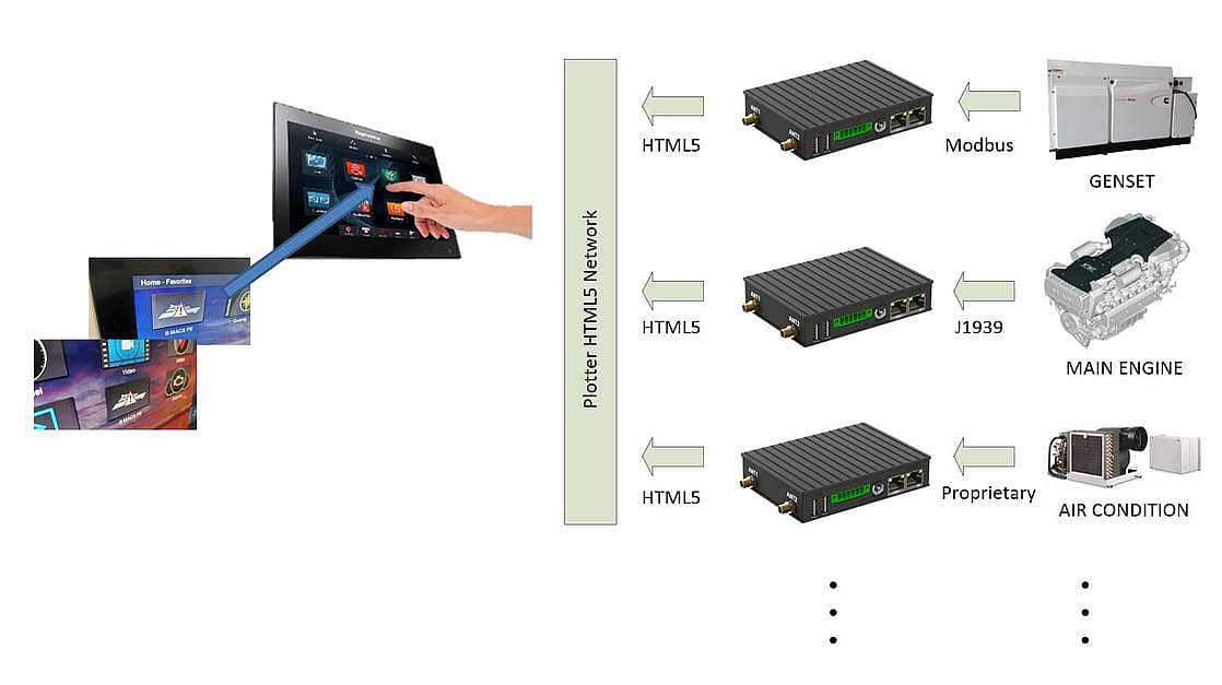 The chart plotter gateway B:LINK is used for direct reading of the communication interface of the system installed on board such as Main Engines, Gensets, Wipers, AirCondition, etc.. Additional converters are not required. The gateway has the capability to read data via CAN bus interface (SAE-J1939, NMEA 2000), serial lines (NMEA 0183, Modbus RTU) and network connection (Modbus-TCP). In addition, various proprietary manufacturer protocols are supported to ensure the best connectivity.