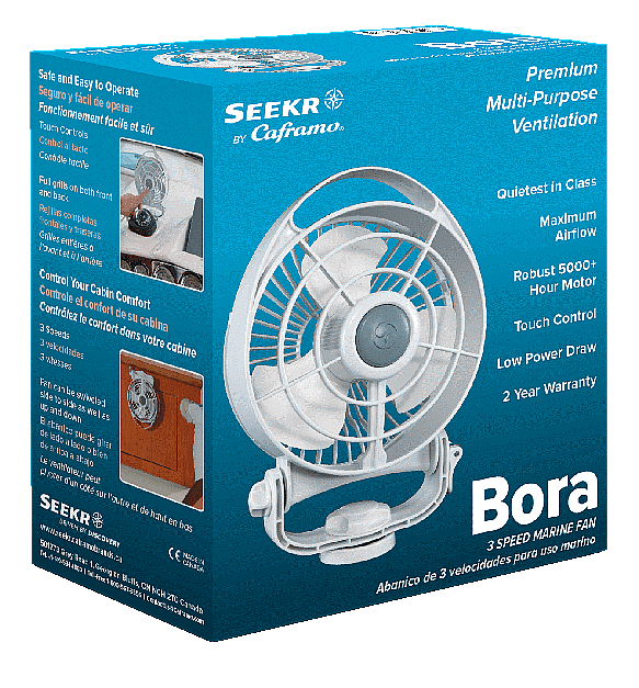 The Bora™ is a beloved airflow solution for mariners worldwide. This direct-wire, high-performance cabin fan is the quietest and most powerful marine fan in its class, and its compact design handles any onboard airflow challenge. Featuring a long-life motor with center push-button control and a built-in handle for up-down, side-to-side positioning. Available in 12V and 24V options. Made in Canada. 130 CFM on high (220 m³/hr) Current draw on low: 0.06A-0.15A Current draw on high: 0.18A-0.27A