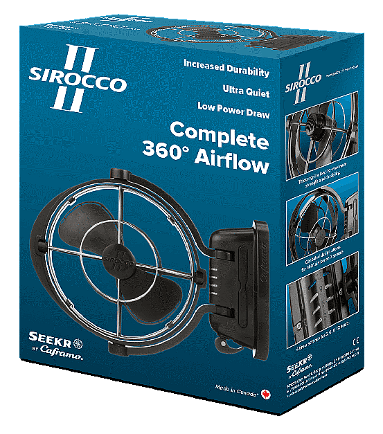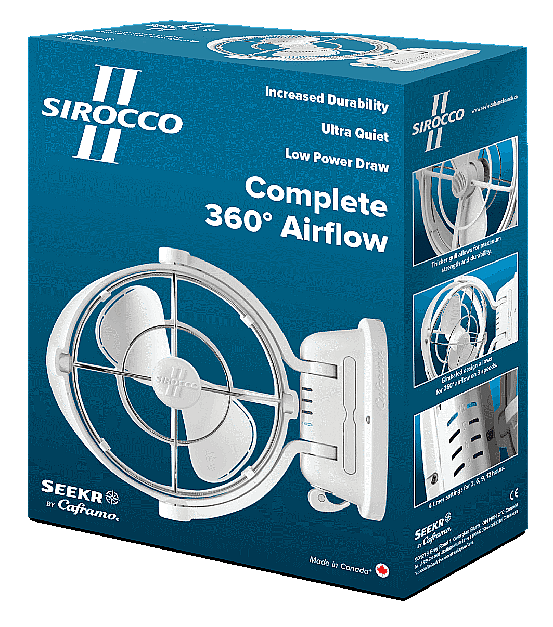 The Sirocco II is a powerful, class-leading fan designed for marine and RV use. The versatile 12V/24V (autosensing) gimbaled design for 360° directional airflow across 3-speed settings provides unmatched comfort. The fan puts minimal strain on batteries, drawing just 0.35A on its highest 12V setting, and is ultra quiet, with 4 auto-off options (3,6,9,12 hours). The fan stows flat at 3.8”, with 7” FingerSafe™ blades, and now holds an extended 3-Year warranty! Available in White or Black.