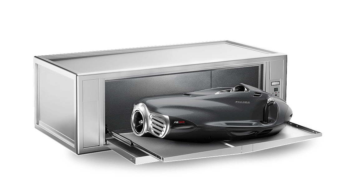 The SEABOB Safety Case meets all requirements of the Marine Guidance Note MGN 681 (M). It is equipped with an automatic extinguishing system and top safety thanks to modern connectivity with your smartphone or tablet. All kinds of electrically powered water sports products as well as lithium-ion batteries are ideally protected in the event of a fire. The safety system also disposes of a catalyst that filters out and neutralizes harmful gases.