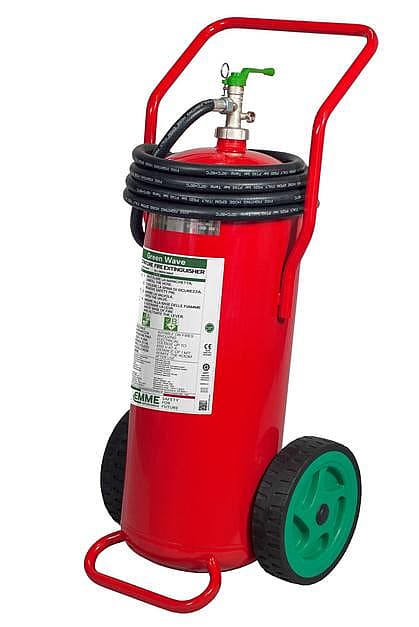 Fluorine-free 50-liter foam fire extinguisher on trolley, designed for maximum mobility and performance in large-scale fire risk areas. Compliant with UNI EN 1866-1 and equipped with pressure indicator, safety valve, and sturdy carriage. Part of Emme Antincendio’s sustainable Green Wave range for professional use and environmental protection.