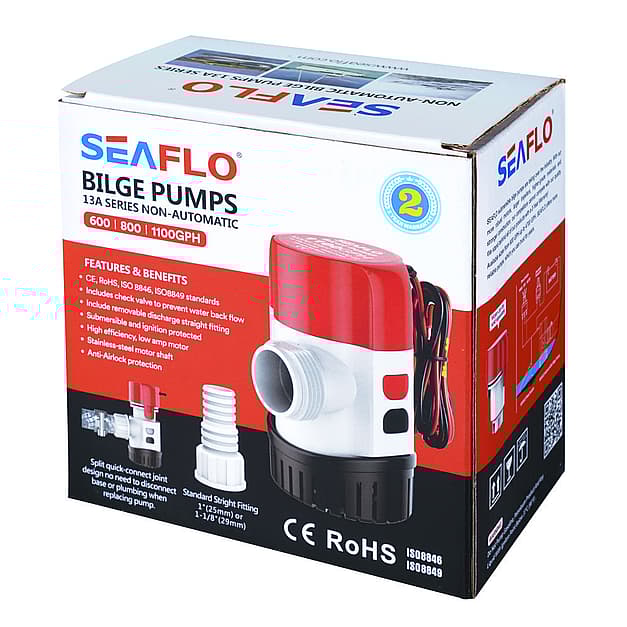 SEAFLO Electric Marine Submersible non-automatic 600-4700GPH bilge pumps offer water evacuation activated by a panel or float switch. Include Anti-Airlock protection and exclusive moisture tight seals, marine grade blocked wiring. Pumps offer a choice of straight or 90 degree ports to suit your installation. Our larger impeller design and more robust motor allow us to outperform our competitors. New innovative split quick-connect joint design removes and installs in seconds! Change pump never been so easy.