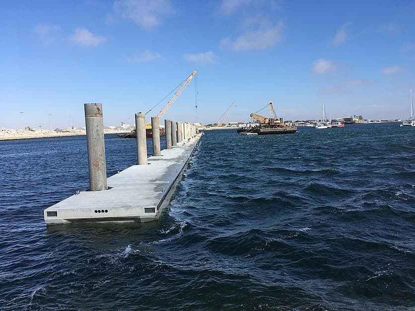 The QMF system (Floating Breakwater) is composed of steel reinforced concrete pontoons with polystyrene core, creating a massive and extremely strong