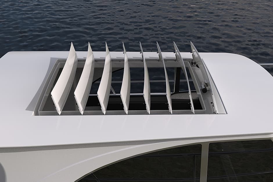 SLEEK AND MODERN ROOF DESIGN FOR THE YACHTING WORLD. The highest quality Makefast Louvred Roof system features rotating and retracting louvres in a single roof, which allows a choice of shade and ventilation styles. Once rotated to the venting position, the louvres can be fully retracted to give a fully open area. Alternatively, leaving the louvres vented allows a free-flow of breeze and dappled shade.