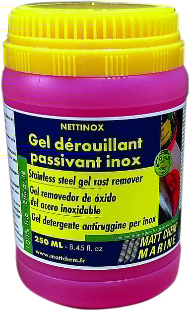 NETTINOX removes in one treatment rust spots on all stainless steel components : pulpits, stanchions, ladders, davits.... Since it is a gel, it is easy to cover all surfaces. Apply the product with a paint brush. Leave between 7 to 12 minutes depending on the amount of rust. Rinse.
