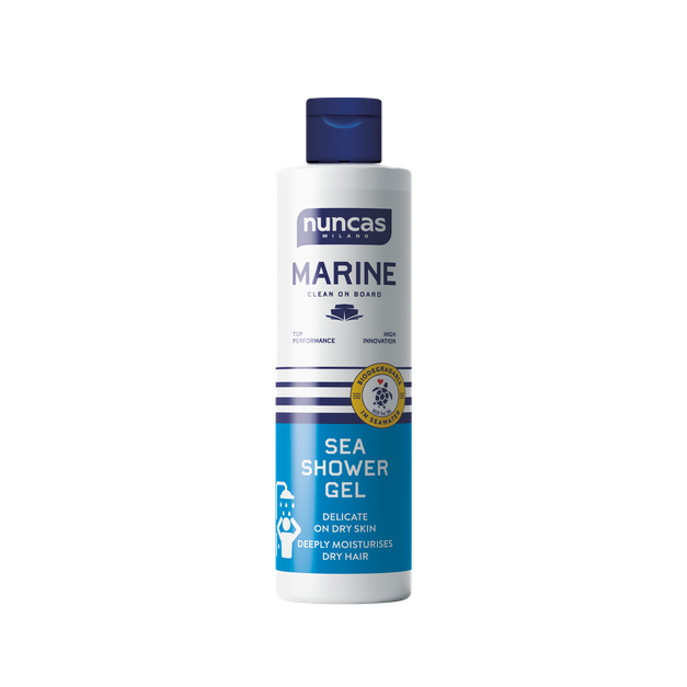 Nuncas Marine Sea Shower gel gently cleans and nourishes skin and hair after sun, wind, and salt exposure, with a biodegradable, marine-safe formula