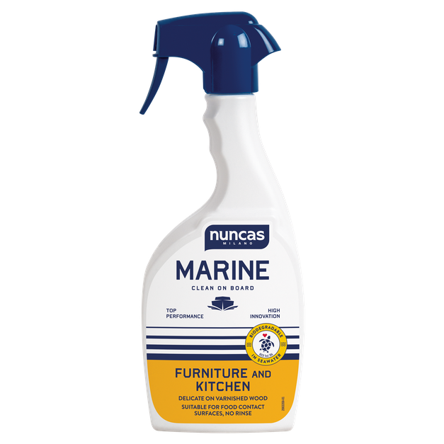 Nuncas Marine Furniture & Kitchen is a universal degreaser for daily cleaning of interior boat surfaces. Made with natural-origin ingredients, it cleans dinettes, tables, worktops, fridges, microwaves, and other food-contact surfaces. The formula removes grease and odors, acts quickly, and requires no rinsing. Safe on steel, Corian®, laminate, wood, plastic, quartzite, silestone, and glass, keeping interiors clean and fresh.