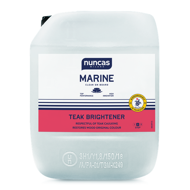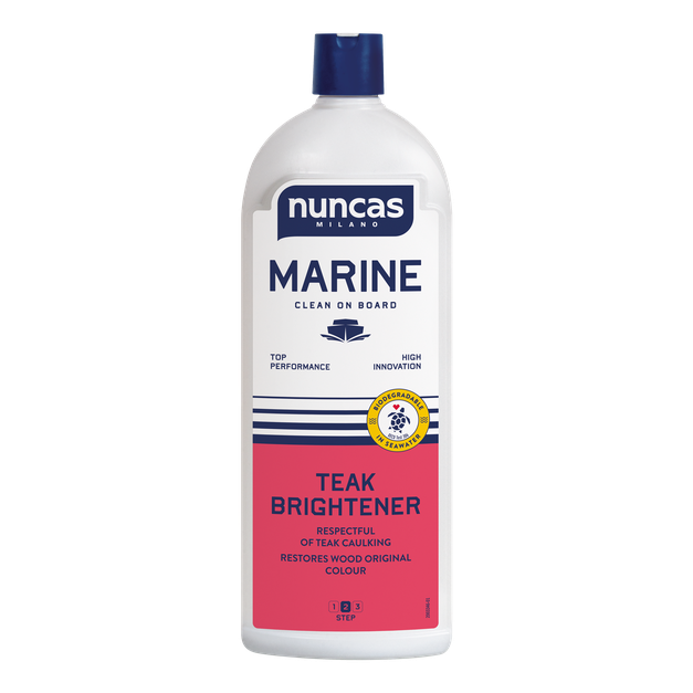 Nuncas Marine Teak Shampoo is the liquid detergent, easily diluted in water, for the routine cleaning of teak decks and furniture. Its special formula, based on coconut soap, gently cleanses and degreases the wood, lathering without damaging the deck seals. Easy to rinse, it removes all types of stains: atmospheric dirt, dust, food, body and SPF creams. After washing, the wood can be restored to its original colour with Nuncas Marine Teak Brightener.