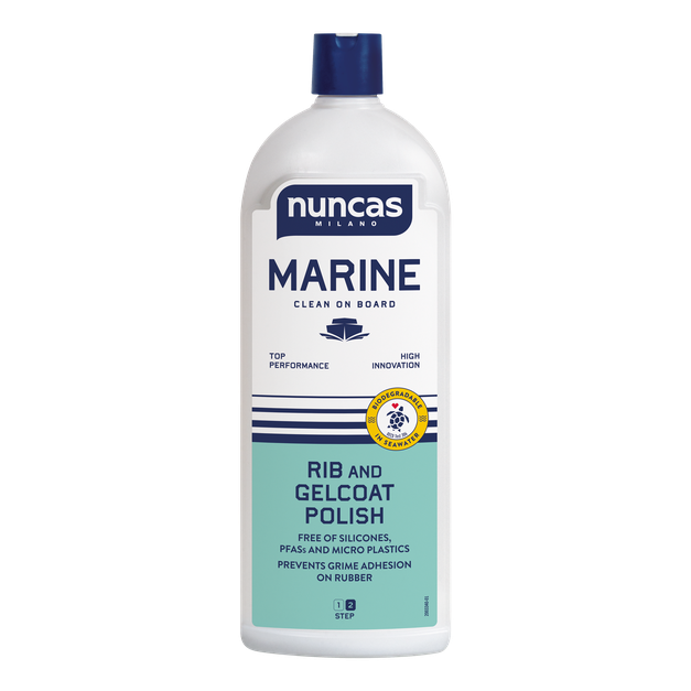 Nuncas Marine RIB & Gelcoat Polish polishes hulls and rubber, giving shine, protection, and a long-lasting water-repellent effect.