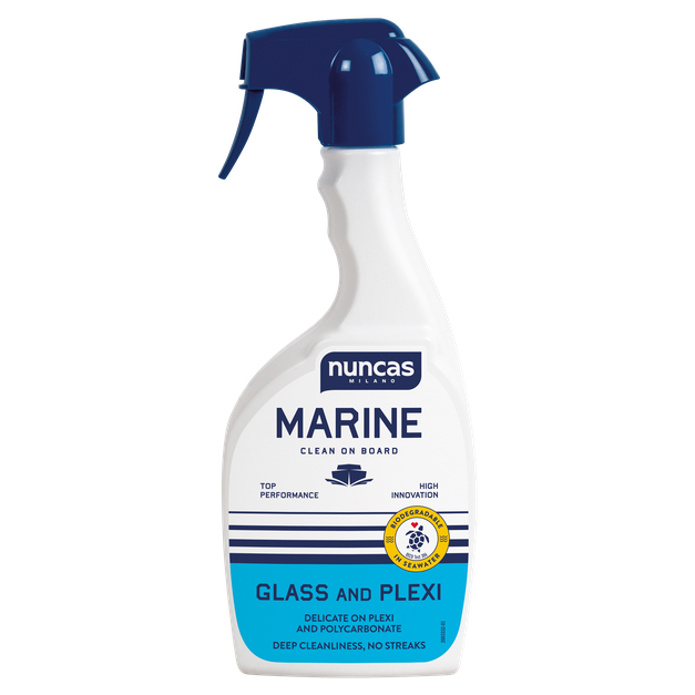 Nuncas Marine Glass & Plexi is the specific cleaner for glass, mirrors, Plexiglass and polycarbonate. Specially formulated without alcohol and with solvents of natural origin, it acts quickly and effectively removes dust, hand/footprints, insect traces and raindrops. Ideal for exterior glass and salt stains. It does not dull synthetic glass and does not leave halos.