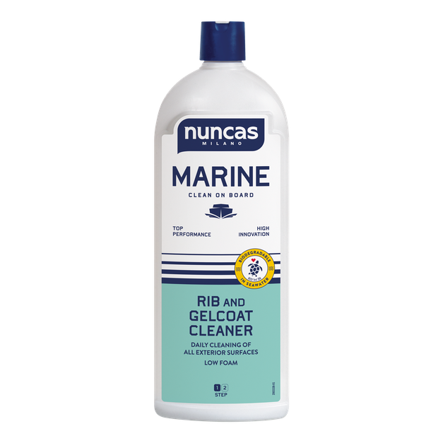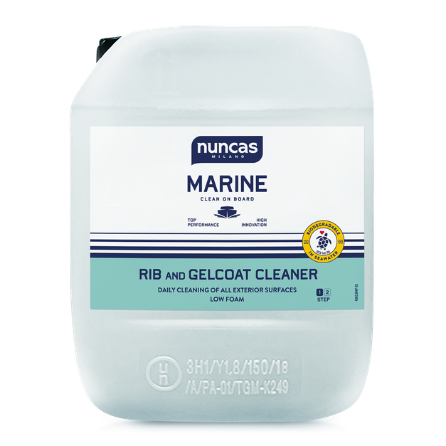 Nuncas Marine RIB & Gelcoat Cleaner is a concentrated detergent with natural-origin ingredients that effectively removes dirt, dust, oil, rubber, algae and salt from gelcoat hulls and dinghy tubes. Producing little foam, it can be diluted in seawater and rinses easily. Safe for painted surfaces and metal, its degreasing action prepares gelcoat and rubber for subsequent polishing with Nuncas Marine RIB & Gelcoat Polish, ensuring optimal cleaning and protection.