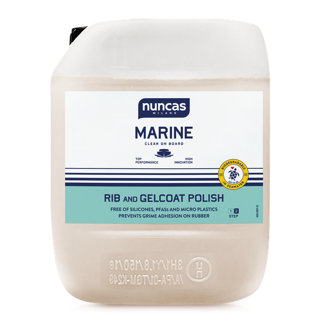 Nuncas Marine RIB & Gelcoat Polish polishes hulls and rubber, giving shine, protection, and water repellency. Safe, biodegradable. 5L.