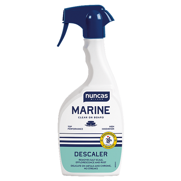 Nuncas Marine Descaler is a professional descaling cleaner designed to remove stubborn salt, rust and oxidation from steel and chrome surfaces on boats. Thanks to its high concentration of natural acids, it eliminates dull patina caused by deposits, restoring brightness to ladders, bollards, handrails, propellers and other steel parts. Versatile and safe, it is also ideal for copper, brass, plastics, and effective on gelcoat and rubber, removing stains and yellowing without damage.