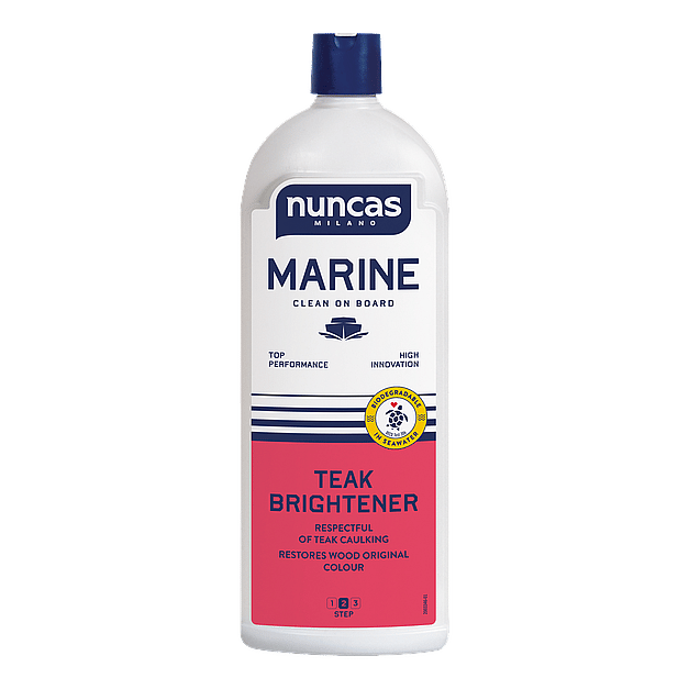 Nuncas Marine Teak Brightener is the ideal solution to remove the grey patina that forms on teak floors, furniture and finishing touches over time. Formulated with naturally occurring acids, it gently removes signs of ageing caused by sun and weather, restoring the wood’s original natural color without damaging its structure. This treatment prepares teak surfaces for subsequent application of Nuncas Marine Teak Oil, ensuring deep nourishment and long-lasting protection.