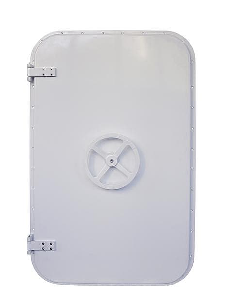 aluminium hinges; locking with four 316 stainless steel dog locks; internal and external wheel handle opening; painted white RAL 9010; EPDM gasket.
