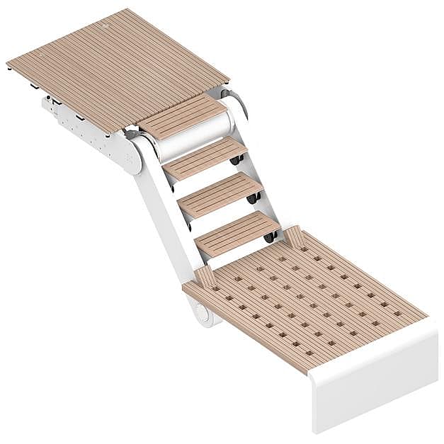 Hydraulic ultracompact multifunctional platform, particularly suitable for installation on medium and small boats. It can be installed both on transom and bulwark and performs gangway, ladder, tender lift and goods lift functions. When totally open in horizontal position, it triples the transom depth. It is available in various dimensions, number of steps and loading capacities according to the model.