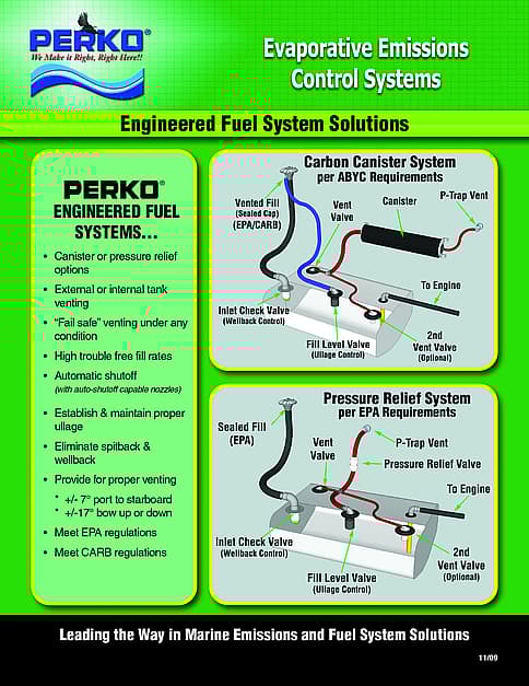 PERKO Engineered Fuel Systems meet all of the new EPA & CARB diurnal emission regulations using time proven automotive components. These components have been specifically adapted to marine industry needs and provide a robust, reliable solution regardless of the style, material or size of your tank(s) and boat.