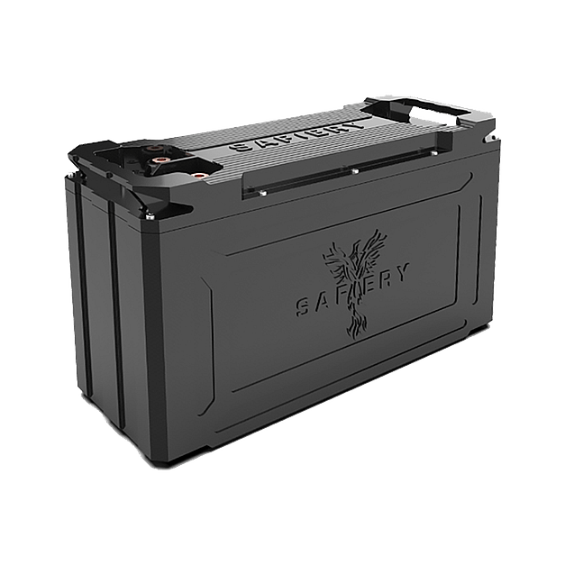 Lithium Iron Phosphate 190Wh/kg Same case size for 12V 24V 48V 420mm x 250mm x 150mm 20kg. Discharge at 7,500W continuous. Interlocking Stackable for smallest foot print of 420 x 150 by 1.2m high for 11.3kWh. Suitable for electric propulsion of marine tenders and small boats up to 45kW at 48V. CAN BMS and Bluetooth. Bluetooth reads entire battery train. IEC 62619 and CE Approvals
