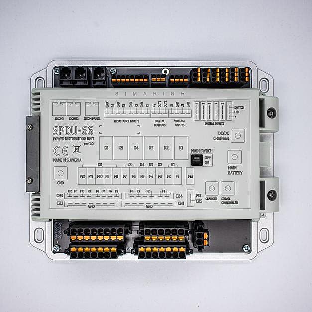 The SPDU-66 is Simarine’s high-capacity 12 V DC distribution unit. It provides 6 switchable outputs (combined limit 100 A), 4 current-measuring channels for solar, charger, main battery, and DC/DC (0–50 A), 6 digital inputs for external switches, plus voltage (U1–U4) and resistance inputs for tanks/temperatures (0–65 kΩ). Typical draw is ~15 mA at 12 V. It connects into Simarine systems and works with PICO/VIA and the SK8 keypad for expanded control. Dimensions: 200×160×42 mm.