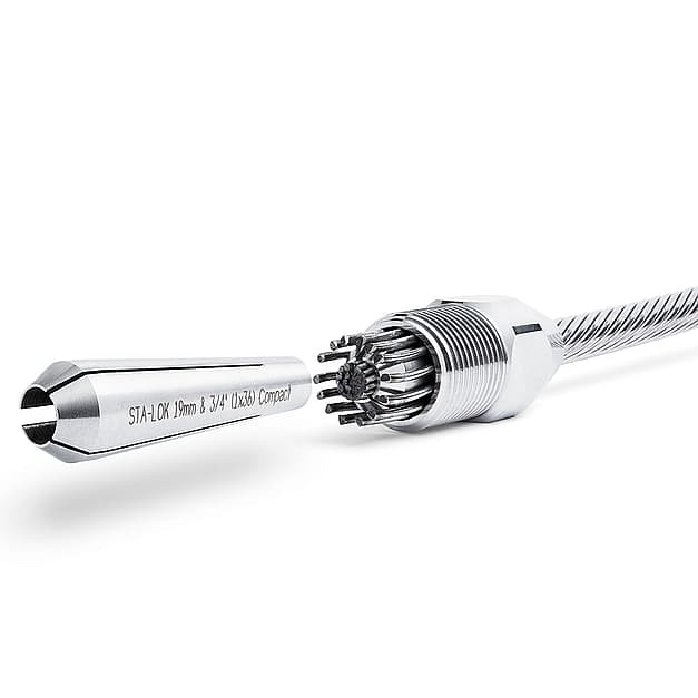 Hand fitted instead of machine swaged. The Sta-Lok system is a simple mechanical method of terminating 1x19, 7x7, 7x19 and compacted strand wire ropes. The Sta-Lok terminal will work under constant loading and variable shock loading. The termination is stronger than the rated breaking load of the wire rope we recommend.
