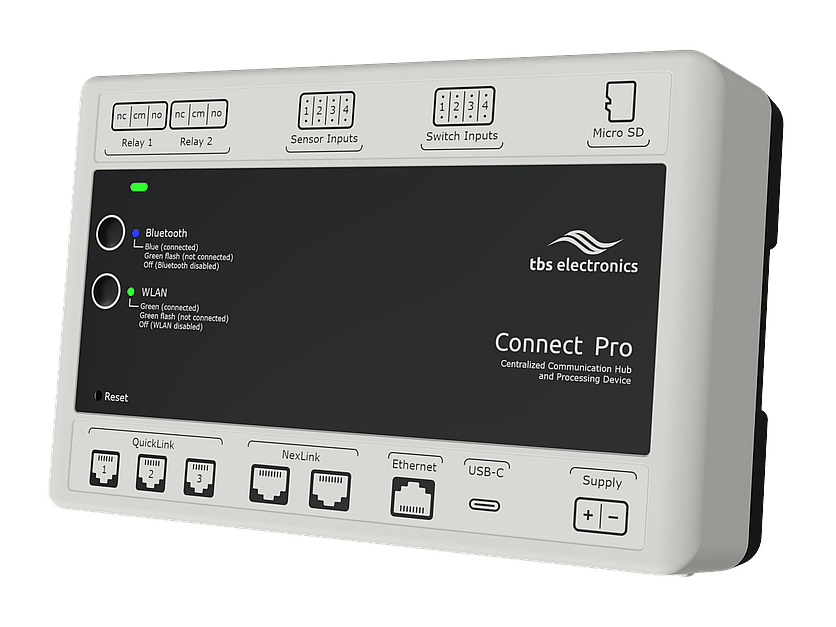 Connect is the intelligent communication and processing hub designed to be the beating heart of your TBS power system. It seamlessly gathers data from all connected TBS devices and routes it to the Control display, a PC via USB, or stores it locally on an SD card for data logging. Future updates will enable mobile app integration and cloud connectivity for remote monitoring (depending on model).
