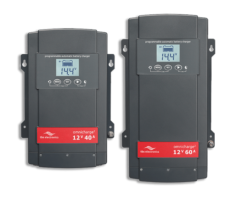 The Omnicharge2 12-40, 12-60, 24-20 and 24-30 are fully programmable, three output, automatic battery chargers designed for professional applications. A clear backlit display shows the charge progress as well as the actual charge voltage and current for each output. A unique new feature of the Omni charge2 range is the autonomous battery output setup. All outputs are not only isolated from each other, but these are also individually programmable.