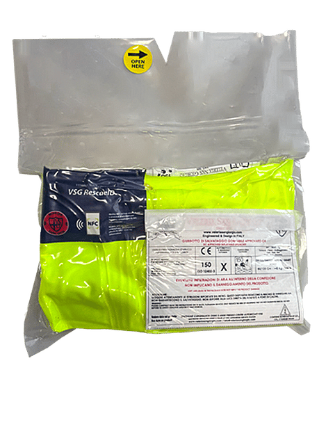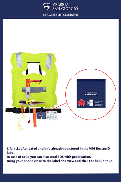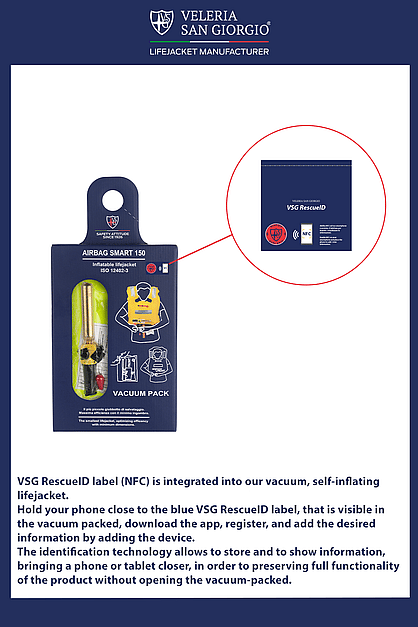 VSG RescueID label (NFC) is integrated into our vacuum, self-inflating lifejacket, the smallest and most compact in the world. The identification technology allows to store and to show information, bringing a phone or tablet closer, in order to preserving full functionality of the product. The key innovation is entering user data, read or update boat information, personal, medical and emergency details without opening the vacuum-packed. In case of need you can also send SOS with geolocation.