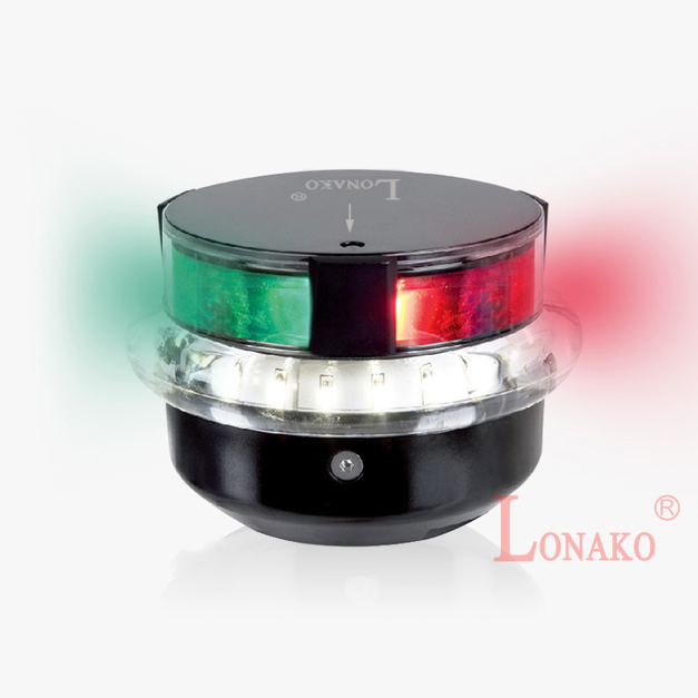 LNK-NS-RGW is a navigation light combining tri-color and all-round white light, which is suitable for all vessels with a length < 12 meters. The light was supplied and controlled by a DC 12 / 24 V input wire. It can show a light intensity of more than 5.6cd and a visual distance of 2N miles. The tri-color navigation light: Left 112.5° RED, Right 112.5° GREEN, Aft 135° WHITE light. When the all-round white light is switched on, it emits an uninterrupted, horizontal white light in a 360° direction