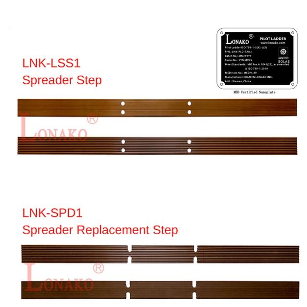 LNK-LSS1 is self-developed composite spreader step specially designed for pilot ladders. It complies with ISO799-1:2019 standards and ISO877-2:2016 Two-year environmental aging test. The spreader step uses an extrusion process to ensure structural consistency and performance stability in mass production. Product weightis only 3.2kg weight, under normal use conditions, the steps do not need to be replaced. It can completely replace wooden spreader step.