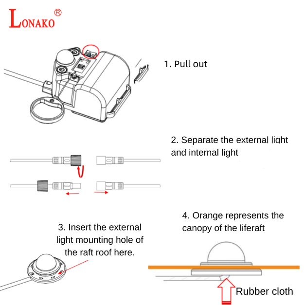 LNK-LR-03A SOLAS Liferaft Light is a lithium battery-powered emergency light to be installed on liferafts. The external light uses LONAKO Patented 3 LEDs that emit a light intensity of more than 4.3 cd for over 15 hours at -30°C. The interior light is integrated with the battery body and is compact, and the mounting clip is equipped for easy installation. The light wire lengths can be customised.