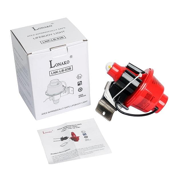 LNK-LB-03B is Intrinsically Safe light compatible with all kinds of lifebuoys. Ex marking “EX I 1G Ex ia op is IIC T4 Ga", suitable for hazardous Zone 0,1 and 2, T4 135°C max, such as offshore drilling platform, oil tanks etc. When the light is thrown into the water, the head of the LED lamp will automatically point upwards and the water sensors will make contact with the water, activating the light instantly, continuously outputs a light of more than 2.0cd for over 20 hours.