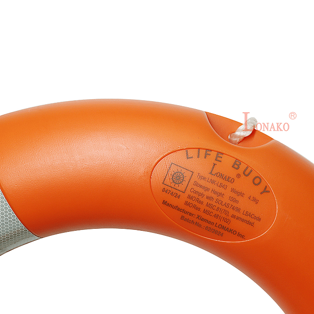 LNK-LB43 SOLAS lifebuoy is used for quickly release to rescue when a person falling into the water during navigation and complies with SOLAS requirements. It typically require simultaneous installation of a lifebuoy light or a self-igniting smoke signal device,. The lifebuoy is installed on both sides of the driving deck, and can be equipped with different lifebuoy lights from LONAKO for different water environments.