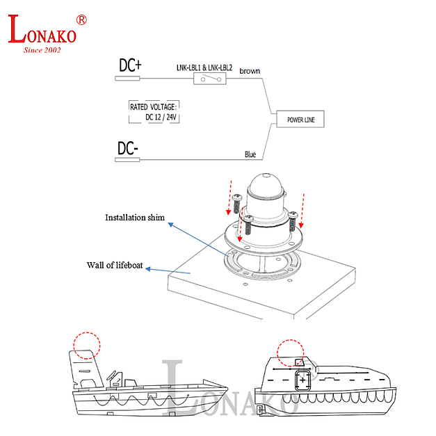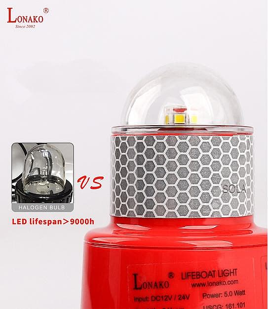 LNK-LBL1 SOLAS lifeboat exterior light is a professional signal light for marine lifeboats and rescue boats. It supplied by DC 12 / 24V power and controled by switch through the input cable. High efficiency and energy-saving multi-LEDS offer light intensite more than 20cd, much higher than the regulatory requirement of 4.3 cd. -52℃ polar low temperature endurance.Wire length 4 metres, customised.