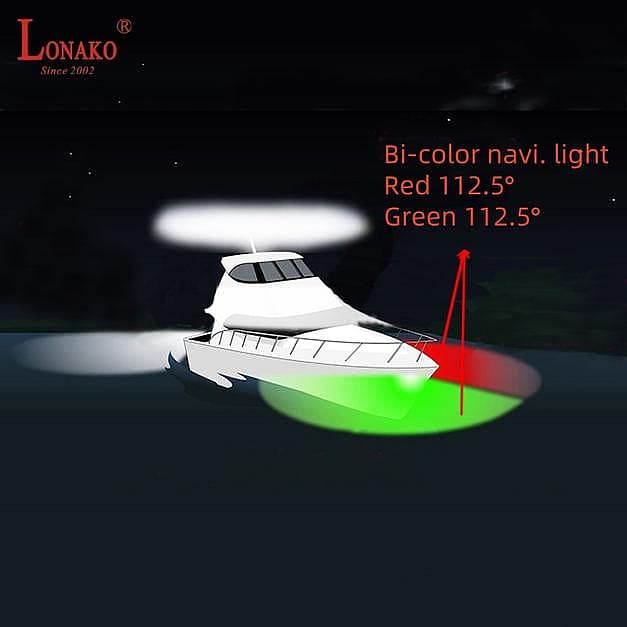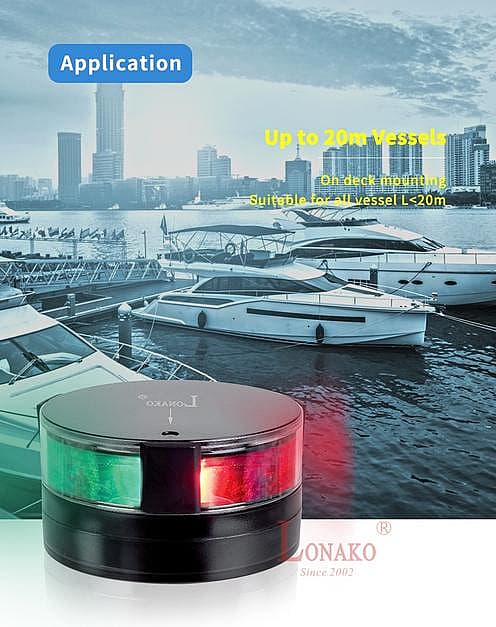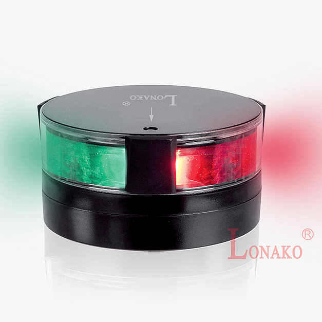 LNK-NS-RG is a red-green bi-color navigation light suitable for all types of vessels with a length < 20 meters. The light was supplied and controlled by a DC 12 / 24 V input wire and is activated by a switch panel control in the cab. Once the lights are turned on, they can emit 112.5° left-red and 112.5° right-green light of a light intensity more than 5.6 cd, with a visibility distance of 2N miles. The working consumption is less than 1.5W.