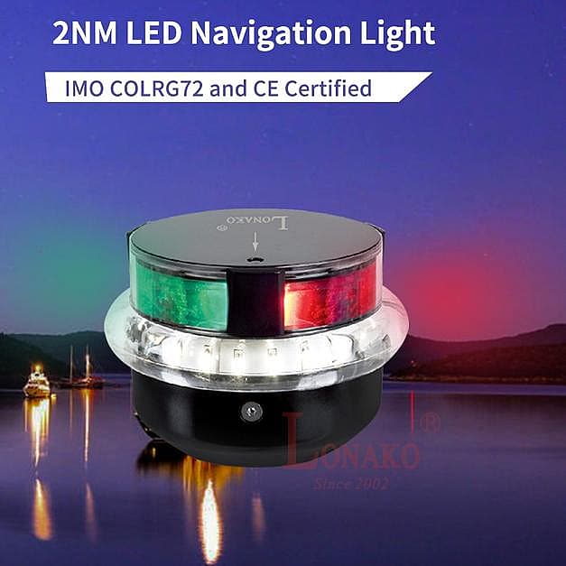 LNK-NS-RGW is a navigation light combining tri-color and all-round white light, which is suitable for all vessels with a length < 12 meters. The light was supplied and controlled by a DC 12 / 24 V input wire. It can show a light intensity of more than 5.6cd and a visual distance of 2N miles. The tri-color navigation light: Left 112.5° RED, Right 112.5° GREEN, Aft 135° WHITE light. When the all-round white light is switched on, it emits an uninterrupted, horizontal white light in a 360° direction