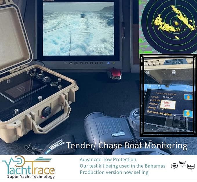 Tender/Chase boat monitoring for on/off tow with anti-theft. Globally available, Plug and Play, fast self install. 2-way comms. Insurance ready