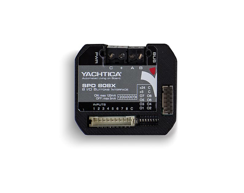 The SPD 808X module is equipped with an integrated microcontroller used to manage 8 dry contact inputs and 8 TTL, or powered by an external power up to 24VDC, outputs. The module can be located inside a standard box or behind a bulkhead. The module is suitable for wiring up to 8 dry contact inputs from command button lighting, TV lifts, curtains and other devices connected to the EasyBUS system.
