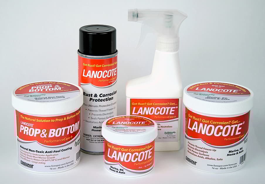 LanoCote® is a safe and natural product formulated to stop and prevent corrosion, rust, oxidation and electrolysis on all types of metals under all environmental conditions. LanoCote® also combats galvanic corrosion where dissimilar metals are fastened together, such as stainless steel to aluminium, etc. LanoCote® is environmentally safe and available in 4 and 16oz jars, 8oz aerosol and 8oz pump spray.