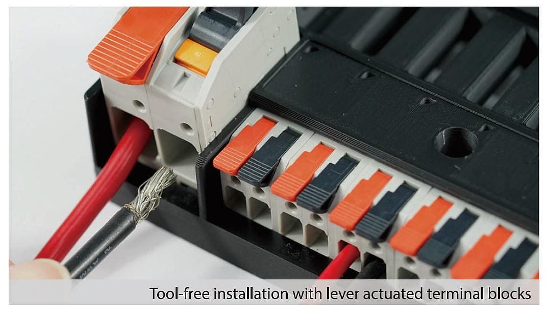 12 Way Fuse Block with ground bus bar, tool-free lever-actuated terminals remove the need for crimping, while dual main positive and negative inputs and twelve circuits with side-by-side terminals simplify installation. The ISO8846 ignition-protected cover with sealed locking clips ensures safety. Patented clips hold covers when opened, avoiding loose parts. With blown-fuse LED indicators, spare fuse slots, this compact, certified unit ensures efficient, safe, and organized power distribution.