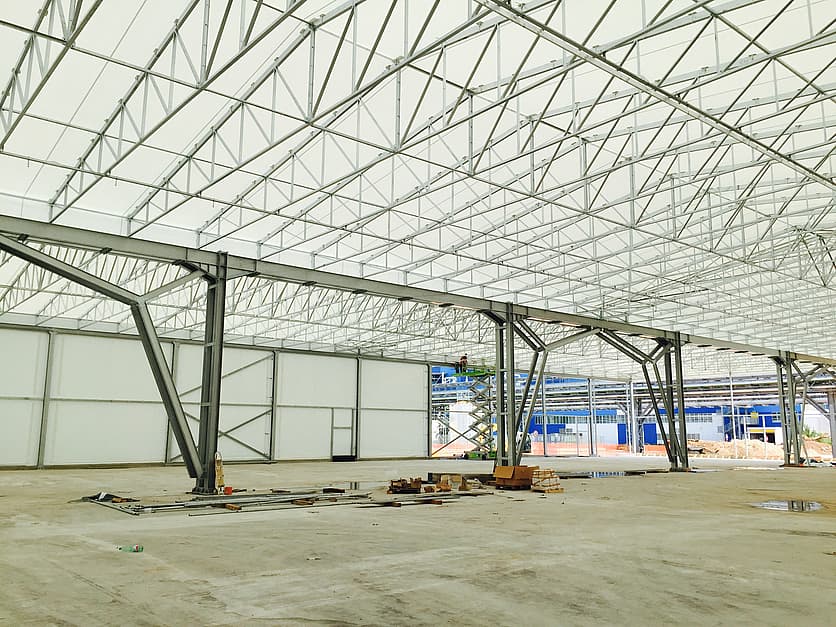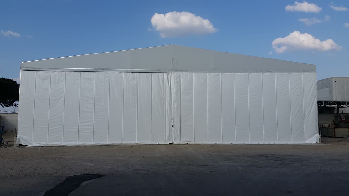 The booth for storage is a metallic carpentry structure with a covering in cloth that covers the arches to the ground on both sides of the length. Depending on the configuration chosen by the customer, it can be fixed or mobile by inserting the packaging system. The arches, connected to each other by a pantograph system, are secured to the ground by means of wheels equipped with a system of anti-lift brackets and by means of tie-rods, to guarantee perfect fixing and total tightness of the same. This without