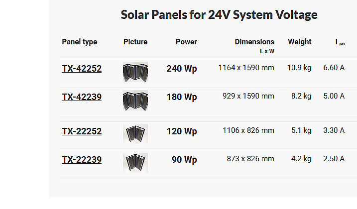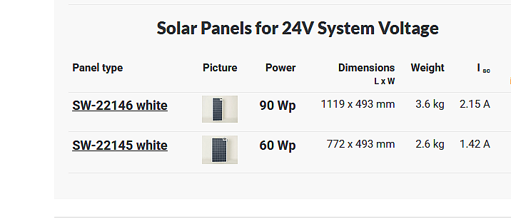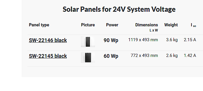 The following solar panels are available for 24 V systems: Series-20 / -40 (Umax: ~43V / Uoc: ~53V), -> 60 Wp, 772 x 493 mm, 2.6 kg -> 90 Wp, 1119 x 493 mm, 3.6 kg Series-TX (Umax: ~39V / Uoc: ~49V), -> 90 Wp, 873 x 826 mm, 4.2 kg -> 120 Wp, 1106 x 826 mm, 5.1 kg -> 180 Wp, 929 x 1590 mm, 8.2 kg -> 240 Wp, 1164 x 1590 mm, 10.9 kg Of course it is always possible to charge 24 V systems by producing a series connection of 12 V panels.